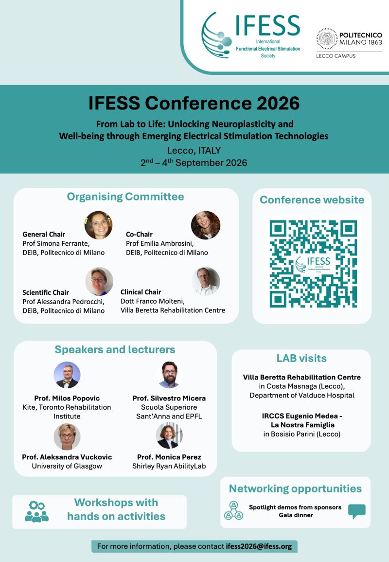 The event marks the 31st annual meeting of the International Functional Electrical Stimulation Society (IFESS) and will be held in Italy for the first time. The conference theme is:
